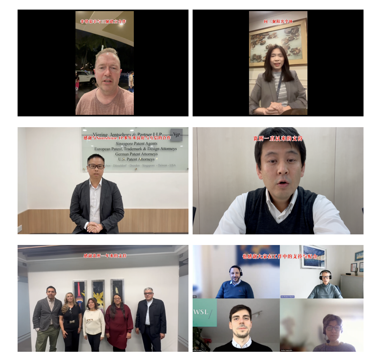 现场播放了来自全国各分公司以及合作外所的拜年视频。从北京总部到香港、华南、华东、浙江、海口等分支机构,再到来自美国、泰国、日本、新加坡、墨西哥等国际合作伙伴,不同地域、不同语言的祝福汇聚在一起。过去一年,三聚阳光深度参与了AIPPI、INTA等国际性会议,这不仅提升了品牌国际影响力,也通过视频串联起了三聚阳光服务全球创新的广阔视野。